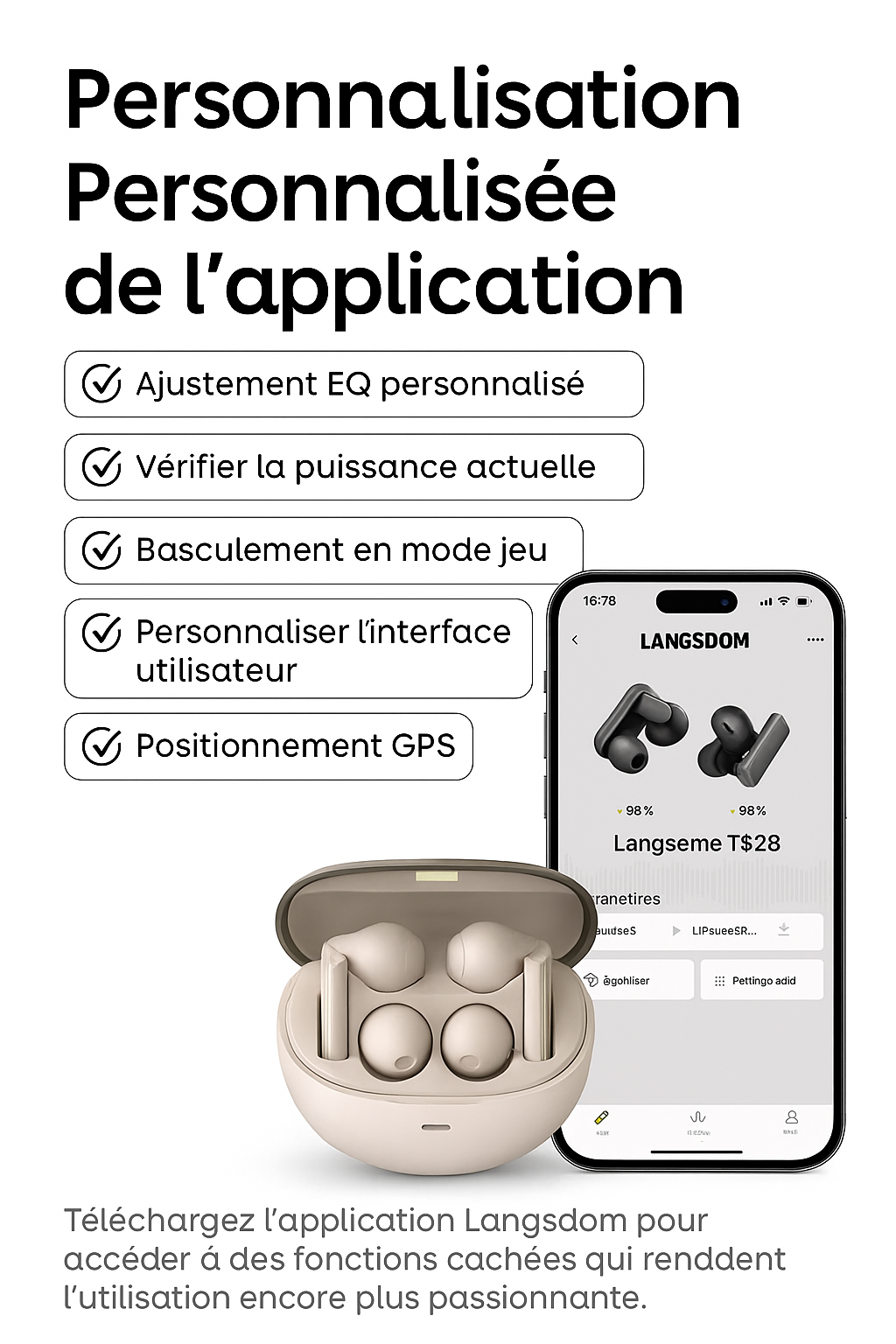 • 🎚️ Application dédiée : personnalisez l’égaliseur (EQ), les réglages de boutons et profitez d’une expérience audio sur-mesure.